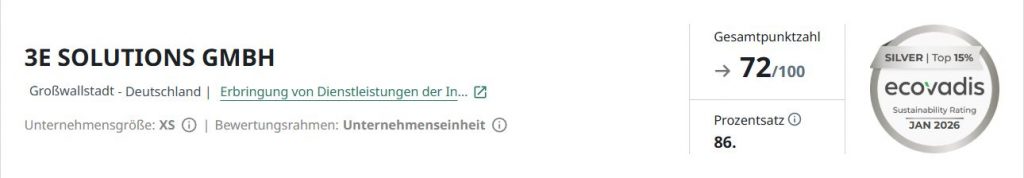 3E SOLUTIONS GMBH befindet sich in den TOP 15% der von EcoVadis beurteilten Unternehmen in der Erbringung von Dienstleistungen der Informationstechnologie Branche.
