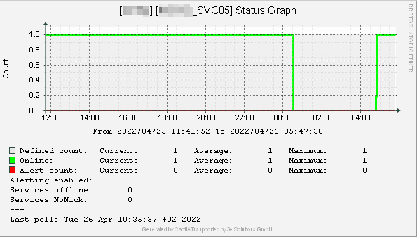 Für diesen Service ist eine geplante Downtime von MO-FR sowie SA + SO notwendig. Von MO-FR ist dies von 00:30 – 04:50. Da der überwachte Service in unserem Beispiel nicht rechtzeitig „online“ war, hat Cacti dies um 04:50 erkannt und die Alertstufe wurde auf „1“ gesetzt. Dies hat zur Folge, dass der Zustand zunächst in ein „Warning“-Modus geschaltet wird. Bestätigt sich der Alert, wird der „Alert“-Modus ausgelöst und es erfolgt eine E-Mail Benachrichtung an den 1st Level Support.