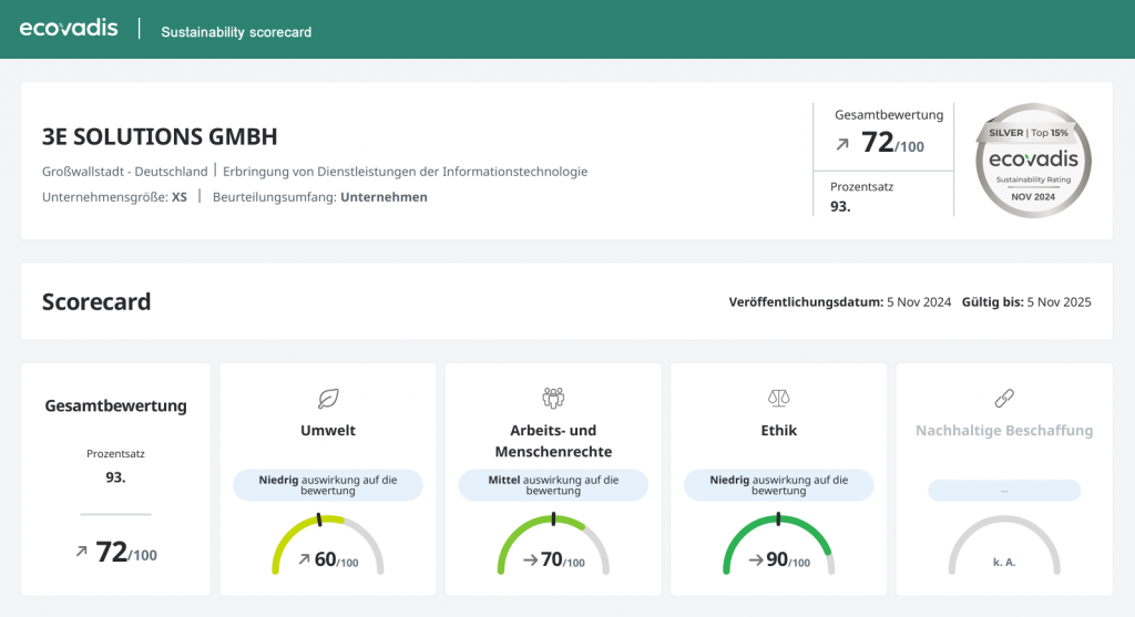 3E SOLUTIONS GMBH befindet sich in den TOP 15% der von EcoVadis beurteilten Unternehmen in der Erbringung von Dienstleistungen der Informationstechnologie Branche.