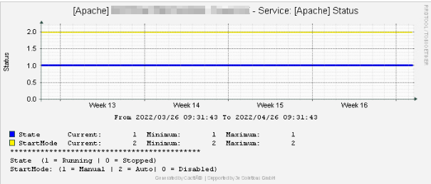 Für diesen Service ist eine geplante Downtime von MO-FR sowie SA + SO notwendig. Von MO-FR ist dies von 00:30 – 04:50. Da der überwachte Service in unserem Beispiel nicht rechtzeitig „online“ war, hat Cacti dies um 04:50 erkannt und die Alertstufe wurde auf „1“ gesetzt. Dies hat zur Folge, dass der Zustand zunächst in ein „Warning“-Modus geschaltet wird. Bestätigt sich der Alert, wird der „Alert“-Modus ausgelöst und es erfolgt eine E-Mail Benachrichtung an den 1st Level Support.